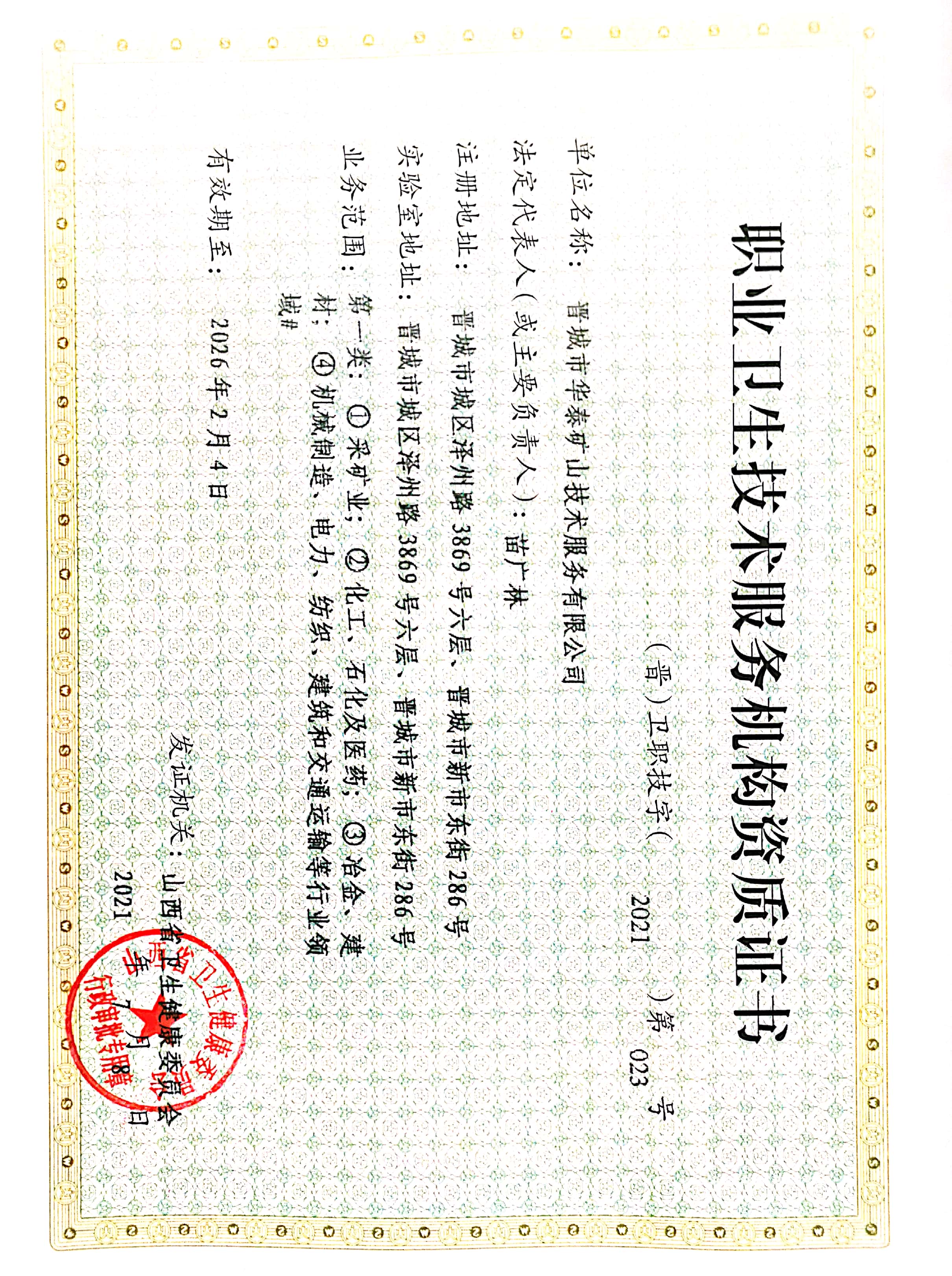 晉城國(guó)投華泰科技有限公司(以下簡(jiǎn)稱華泰公司)是一家經(jīng)營(yíng)性國(guó)有企業(yè),注冊(cè)資金1000.2萬(wàn)元(由晉城市華泰礦山技術(shù)服務(wù)有限公司和晉城澤泰安全技術(shù)服務(wù)有限公司合并整合組建,國(guó)投全資)。公司持有山西省衛(wèi)生健康委員會(huì)頒發(fā)的《職業(yè)衛(wèi)生技術(shù)服務(wù)資質(zhì)證書》、山西省應(yīng)急管理局頒發(fā)的《安全評(píng)價(jià)機(jī)構(gòu)資質(zhì)證書》和山西省市場(chǎng)監(jiān)督管理局頒發(fā)的《檢驗(yàn)檢測(cè)機(jī)構(gòu)資質(zhì)認(rèn)定證書》等資質(zhì),設(shè)施設(shè)備、能力、資質(zhì)配套齊全。...【詳細(xì)信息】